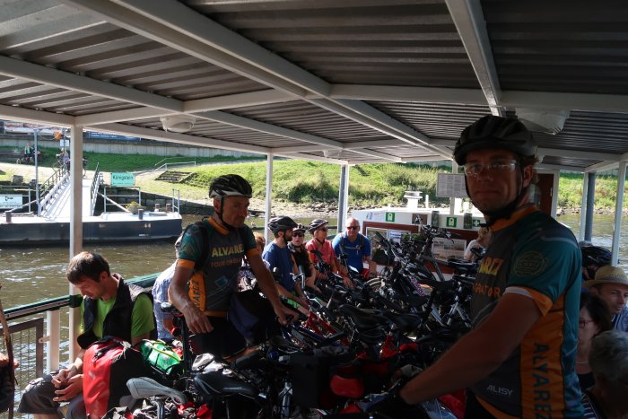 V městečku pod pevností Konigstein přeplouváme přívozem na pravý břeh. Loď je naplněná nad svou kapacitu a několik cyklistů se na ni už nevejde a musí čekat, než se vrátí přeplněná cyklisty z druhé strany.